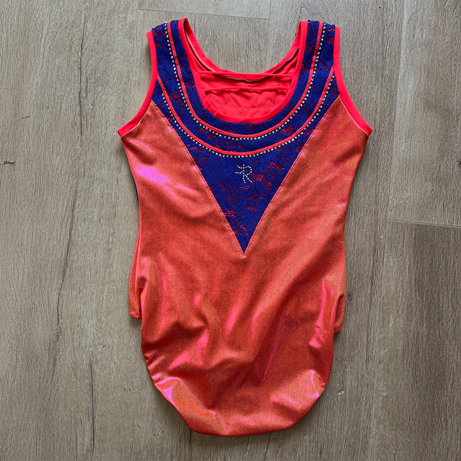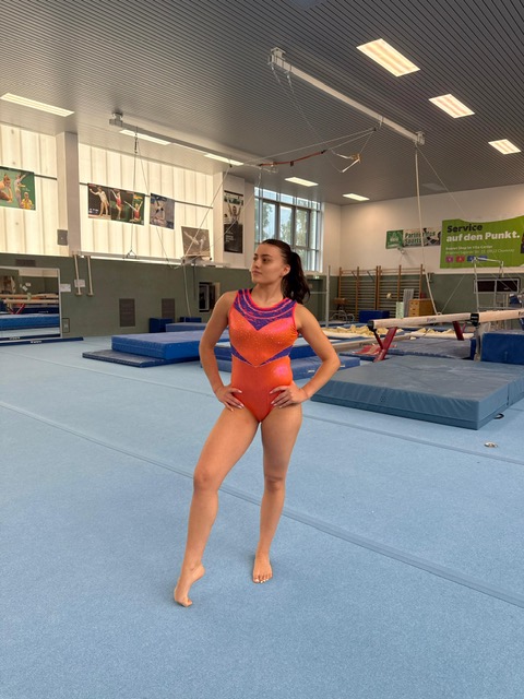 Die satten Farben erinnern an Tigerkraft in Bewegung. Der schimmernde Stoff lebt mit dem Licht – wie der Wechsel zwischen Spannung und Leichtigkeit auf dem Balken.